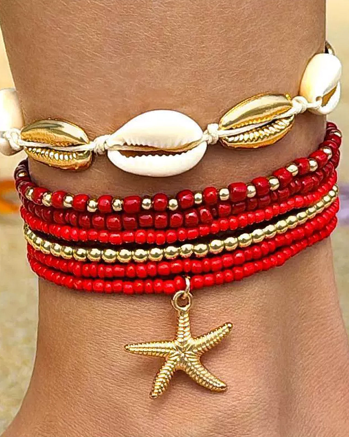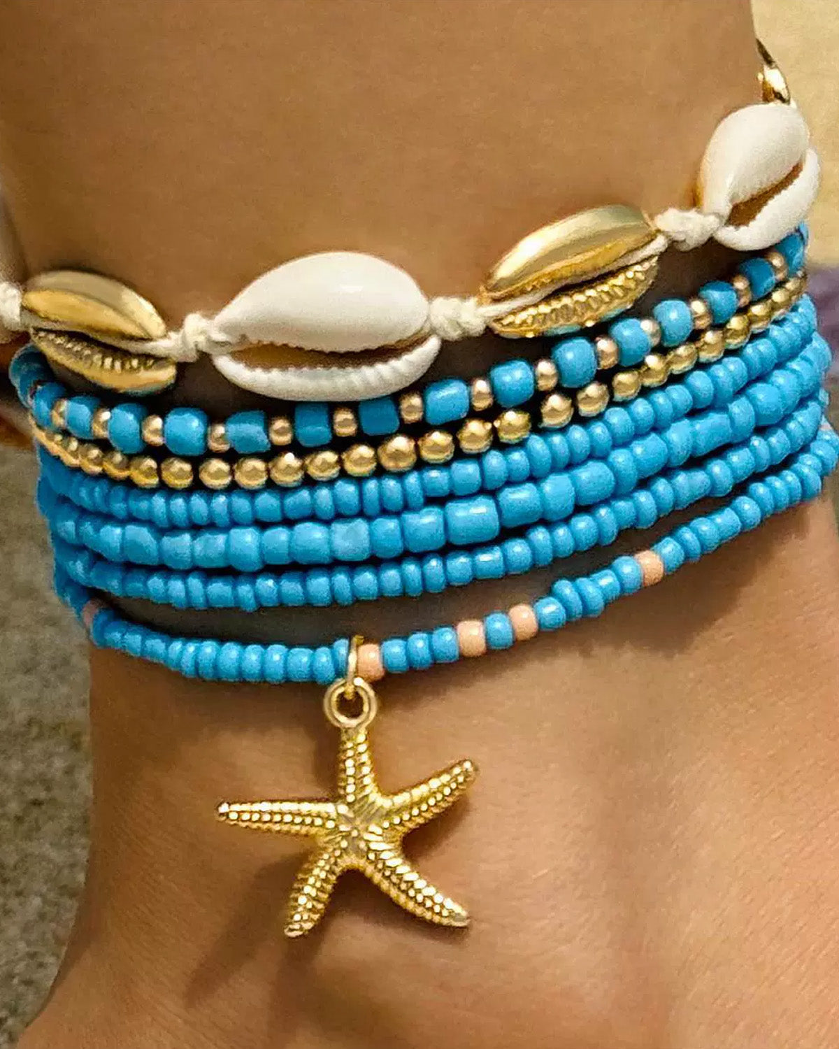 Vibrant five-piece anklets set featuring starfish, shell, seed beads, and playful eye charms. Perfect for beach vacations, poolside style, or adding a breezy boho touch to everyday outfits.