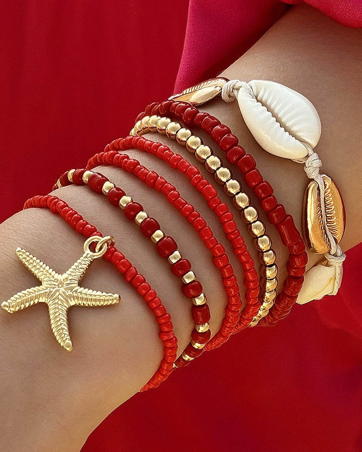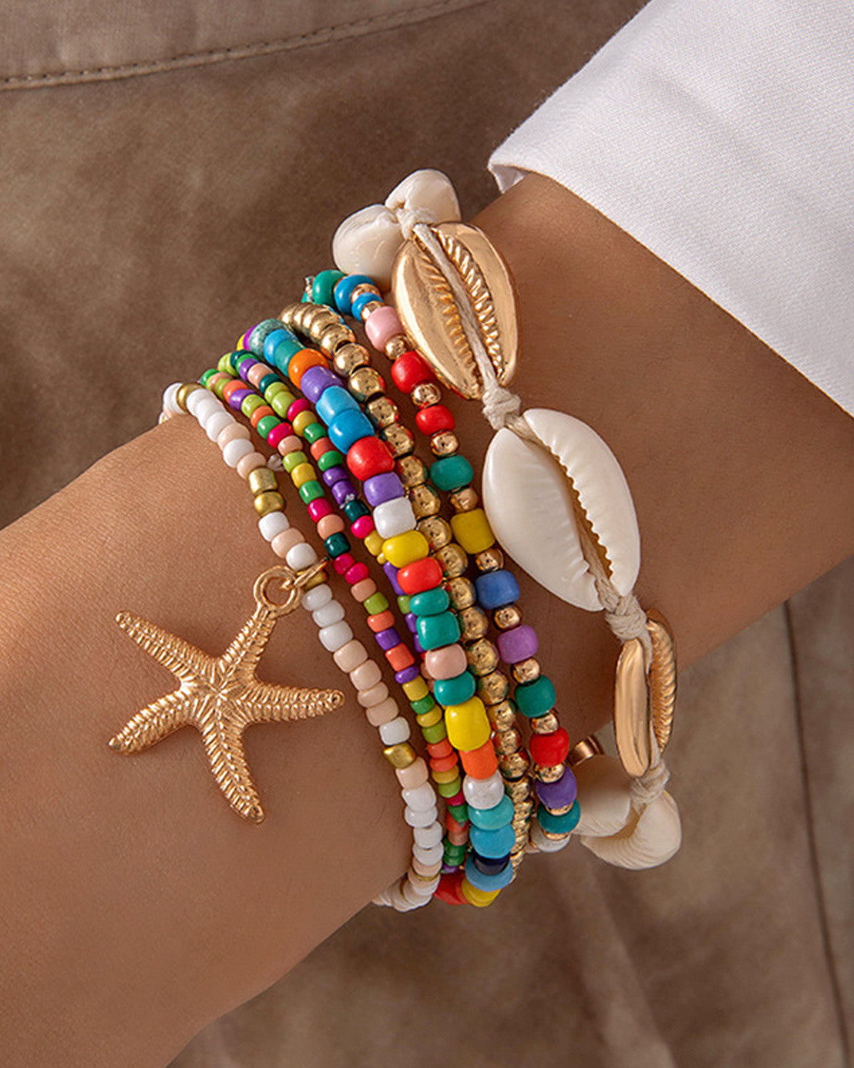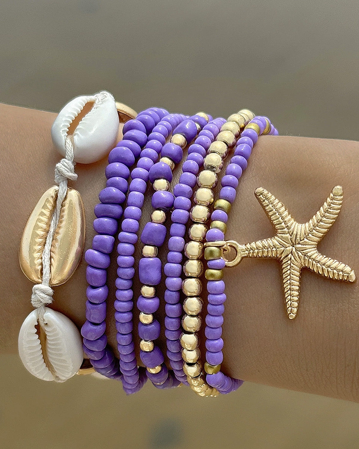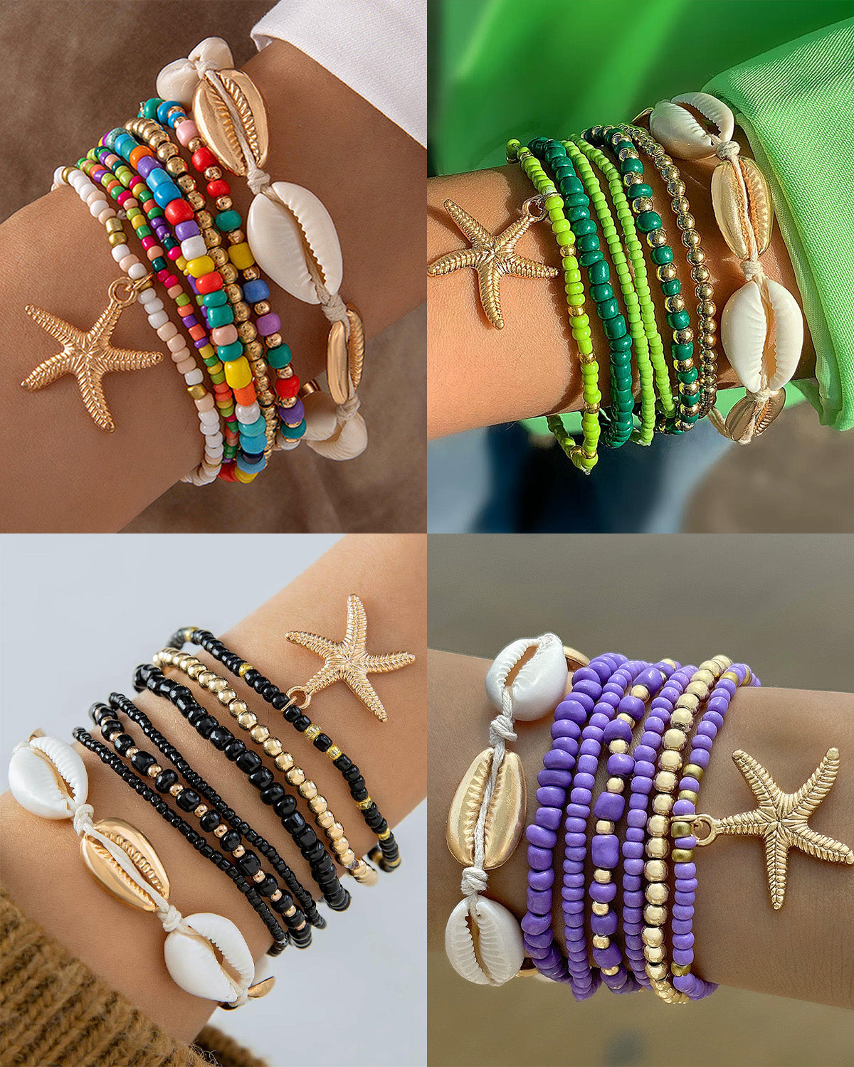 Vibrant five-piece bracelet set featuring starfish, shell, seed beads, and playful eye charms. Perfect for beach vacations, poolside style, or adding a breezy boho touch to everyday outfits.