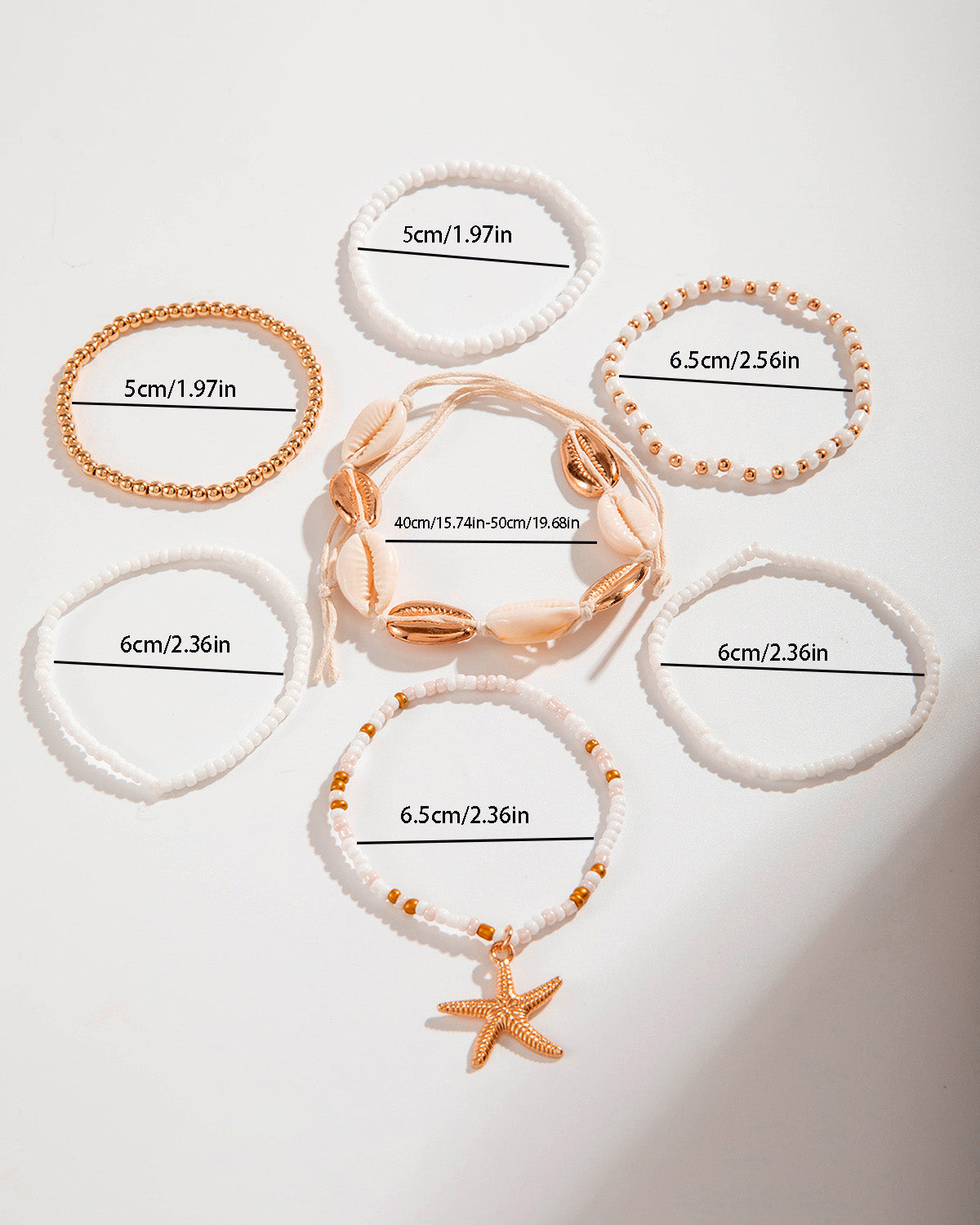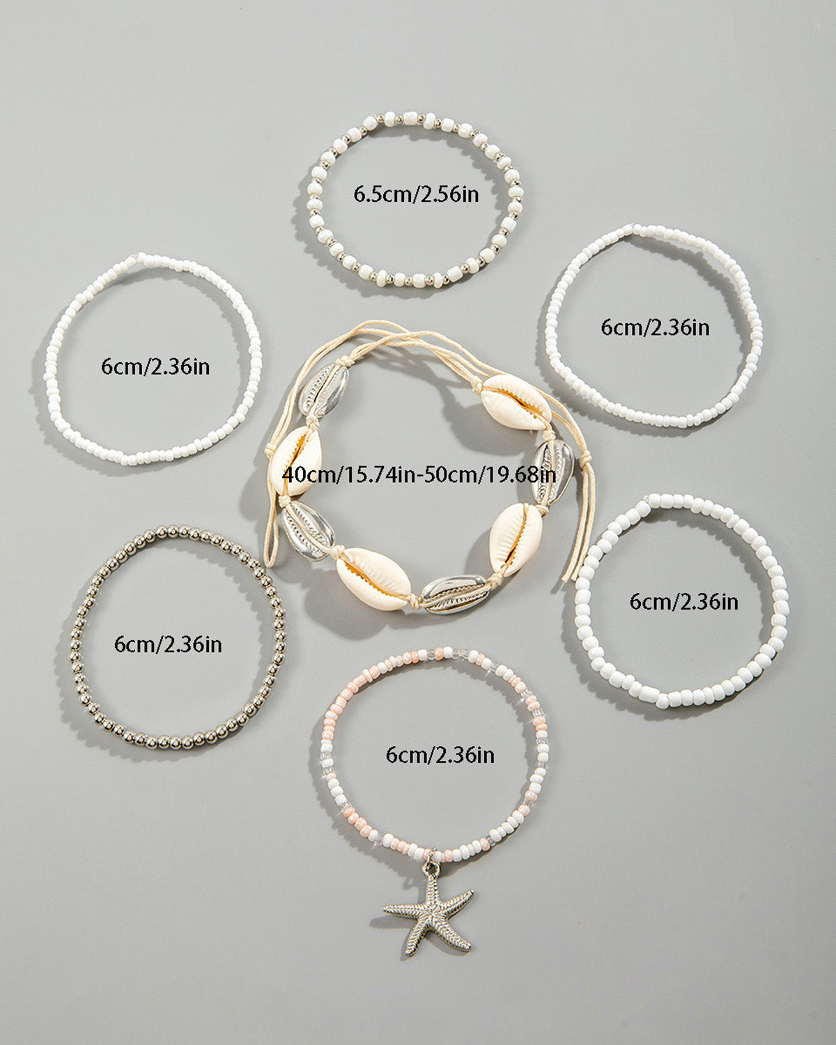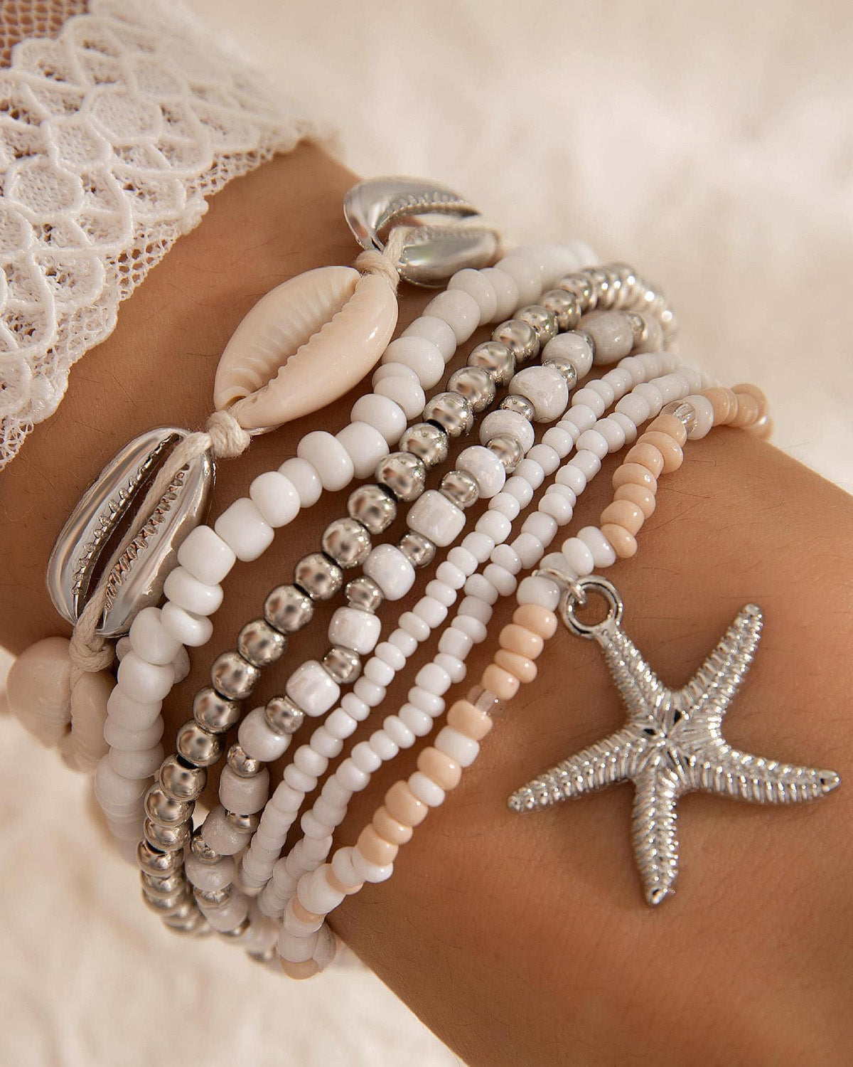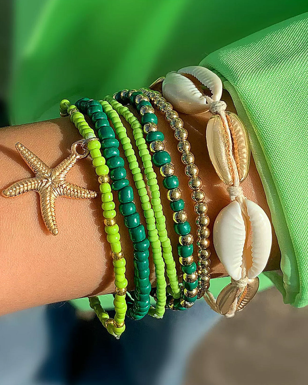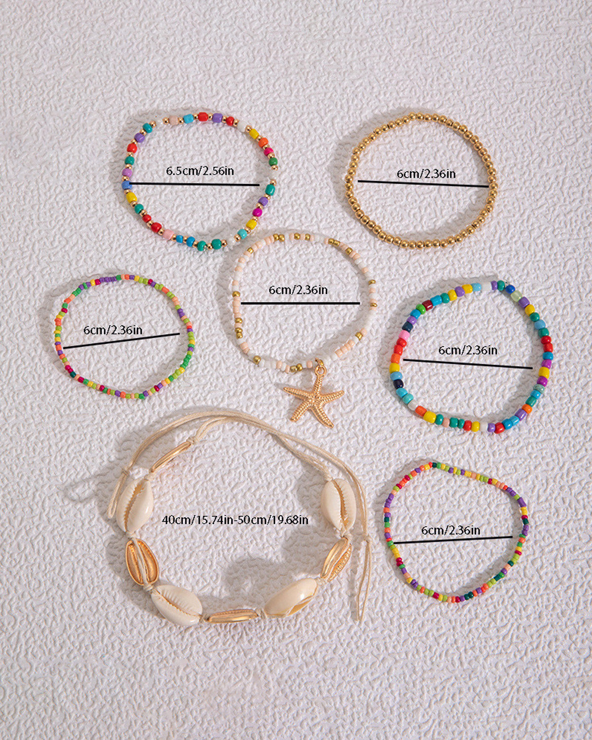 Vibrant five-piece bracelet set featuring starfish, shell, seed beads, and playful eye charms. Perfect for beach vacations, poolside style, or adding a breezy boho touch to everyday outfits.