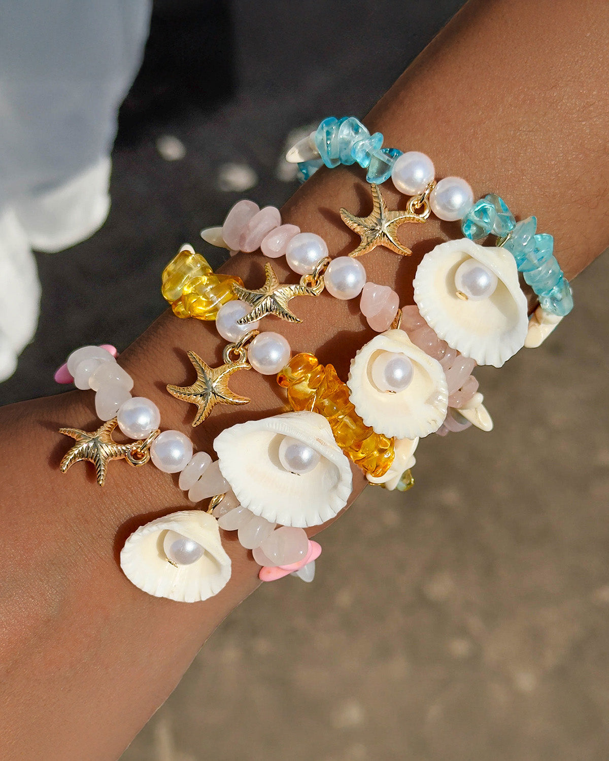 Vibrant five-piece bracelet set featuring Stone, shell, seed beads, and playful eye charms. Perfect for beach vacations, poolside style, or adding a breezy boho touch to everyday outfits.